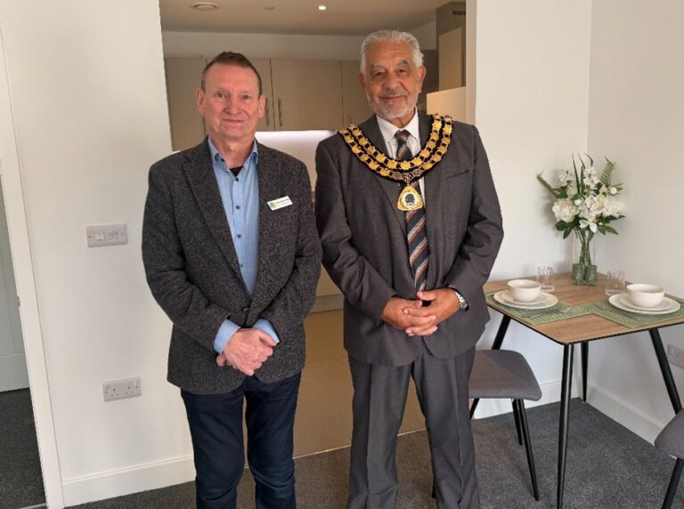 Stephen Sorrell, Social Partnerships Director at Preferred Homes, and Councillor Paul Grafton, Chairman of Ashfield District Council in Gilbert House show apartment
